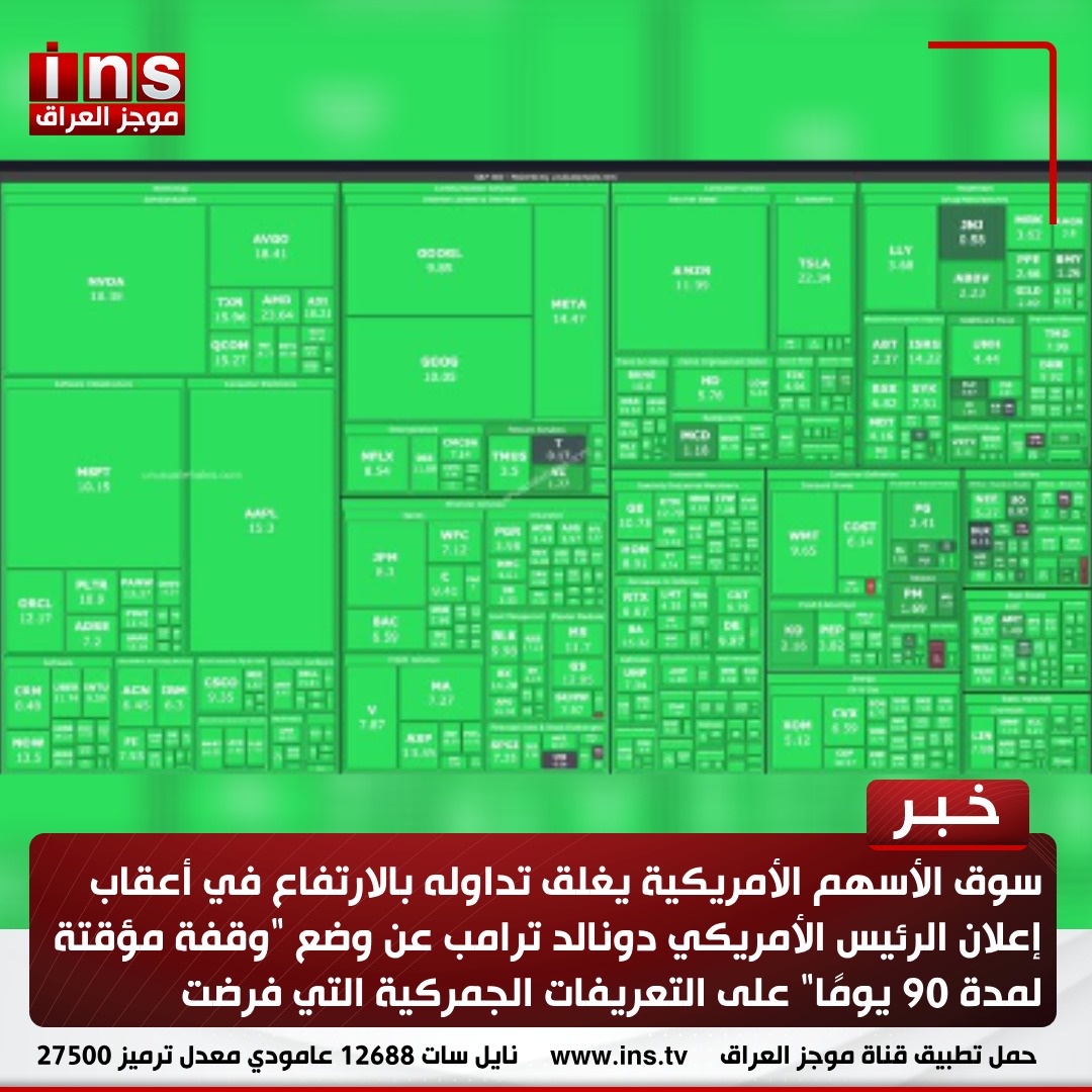 سوق الأسهم الأمريكية يغلق تداوله بالارتفاع في أعقاب إعلان الرئيس الأمريكي دونالد ترامب عن وضع “وقفة مؤقتة لمدة 90 يومًا” على التعريفات الجمركية التي فرضت