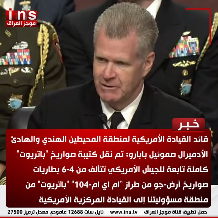 قائد القيادة الأمريكية لمنطقة المحيطين الهندي والهادئ الأدميرال صموئيل بابارو: تم نقل كتيبة صواريخ “باتريوت” كاملة تابعة للجيش الأمريكي تتألف من 4-6 بطاريات صواريخ أرض-جو من طراز “ام اي ام-104” “باتريوت” من منطقة مسؤوليتنا إلى القيادة المركزية الأمريكية