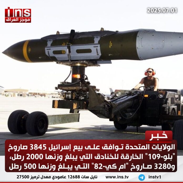 الرئيسيةالأخبارالولايات المتحدة توافق على بيع إسرائيل 3845 صاروخ "بلو-109" الخارقة للخنادق التي... الأخبار الولايات المتحدة توافق على بيع إسرائيل 3845 صاروخ “بلو-109” الخارقة للخنادق التي يبلغ وزنها 2000 رطل، و3280 صاروخ “ام كي-82” التي يبلغ وزنها 500 رطل 0 182 يونيو 30, 2025 كتب بواسطة موجز العراق ins شارك FacebookTwitterPinterestWhatsAppTelegramViberCopy URL شارك FacebookTwitterPinterestWhatsAppTelegramViberCopy URL مقالات ذات صلة الأخبار رئيس الوزراء الإسرائيلي بنيامين نتنياهو: قرار إنهاء الحرب مع إيران كان قراراً إسرائيلياً خالصاً وهناك خطة لهجوم محتمل آخر على إيران نوفمبر 14, 2025 الأخبار رئيس جهاز الاستخبارات الأمنية الكندية دان روجرز: أحبطنا مخططات قاتلة للنظام الإيراني ووكلائه استهدفت معارضيه على أراضينا نوفمبر 14, 2025 الأخبار معهد الدراسات الأوروبية: على الرغم من أن القانون العراقي يحظر رسمياً مشاركة الجماعات المسلحة سياسياً إلا أن النظام ما يزال تهيمن عليه أحزاب الميليشيات نوفمبر 14, 2025