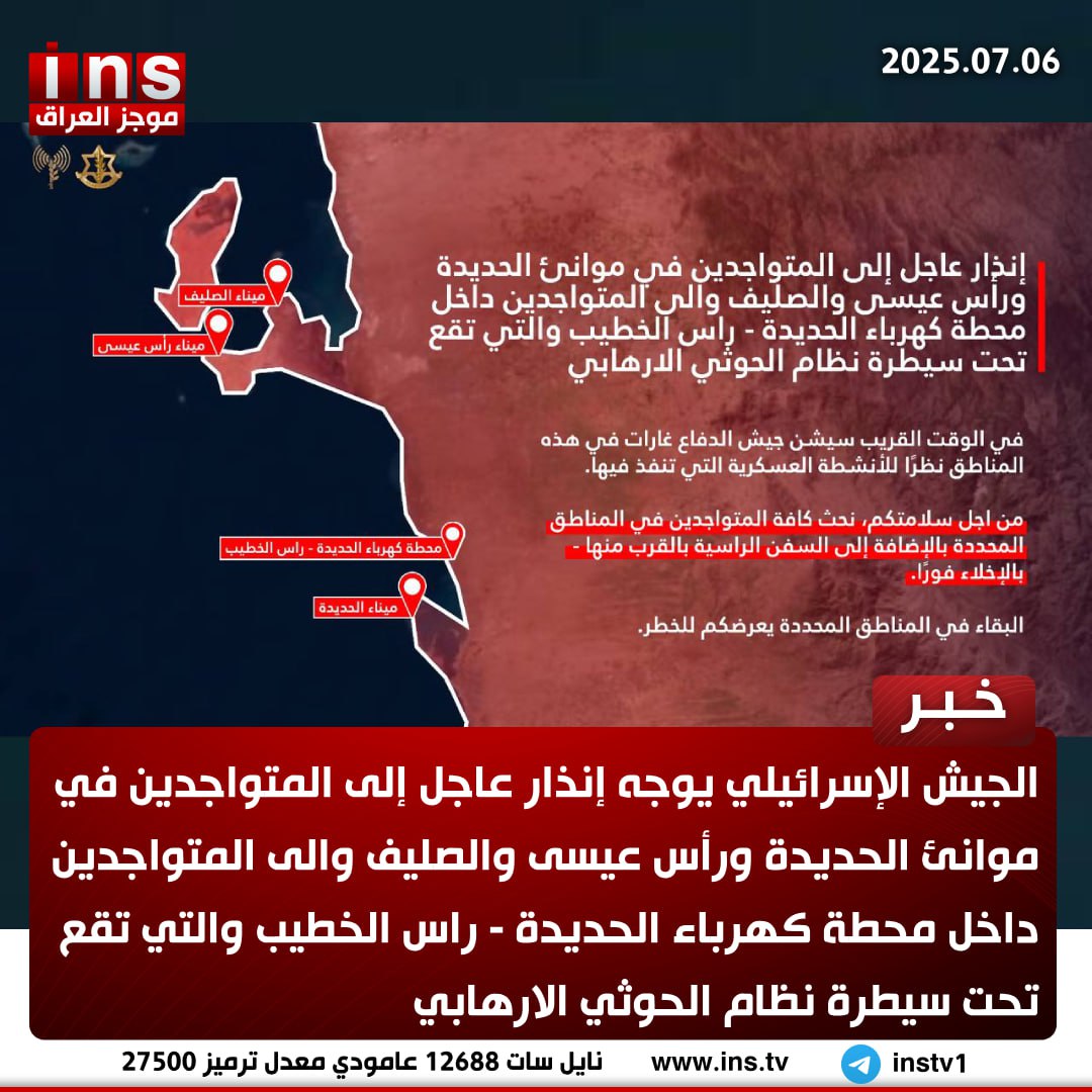 الجيش الإسرائيلي يوجه إنذار عاجل إلى المتواجدين في موانئ الحديدة ورأس عيسى والصليف والى المتواجدين داخل محطة كهرباء الحديدة – راس الخطيب والتي تقع تحت سيطرة نظام الحوثي الارهابي
