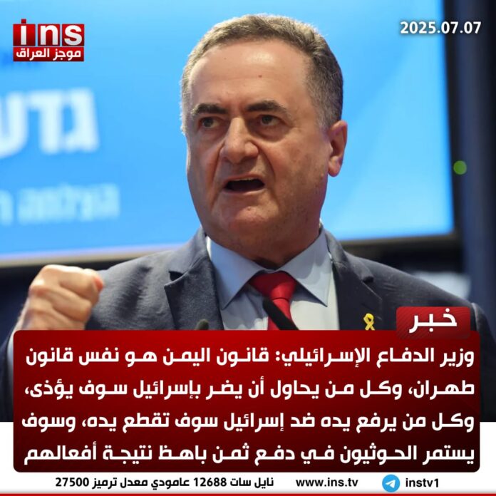 وزير الدفاع الإسرائيلي: قانون اليمن هو نفس قانون طهران، وكل من يحاول أن يضر بإسرائيل سوف يؤذى، وكل من يرفع يده ضد إسرائيل سوف تقطع يده، وسوف يستمر الحوثيون في دفع ثمن باهظ نتيجة أفعالهم