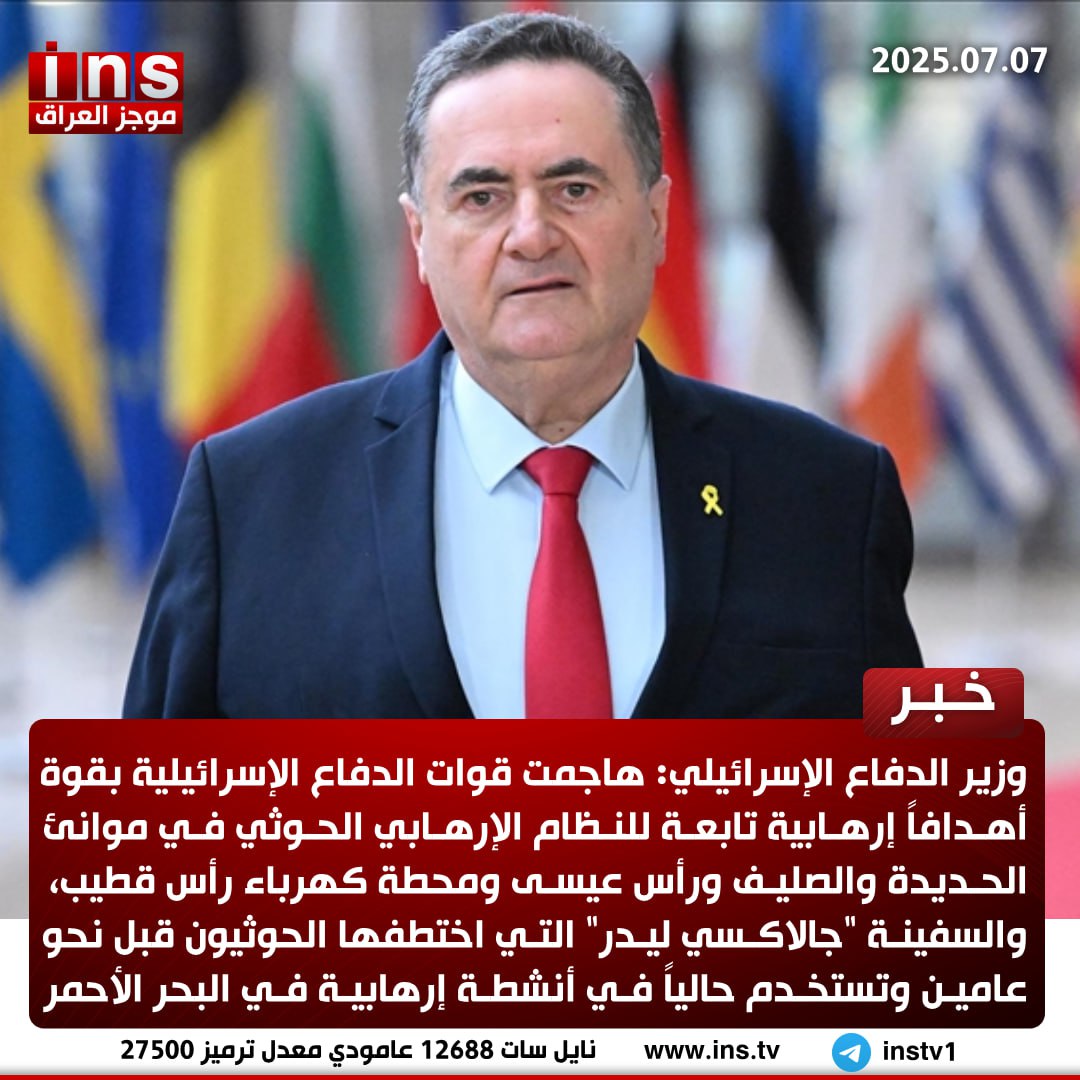 وزير الدفاع الإسرائيلي: هاجمت قوات الدفاع الإسرائيلية بقوة أهدافاً إرهابية تابعة للنظام الإرهابي الحوثي في موانئ الحديدة والصليف ورأس عيسى ومحطة كهرباء رأس قطيب، والسفينة “جالاكسي ليدر” التي اختطفها الحوثيون قبل نحو عامين وتستخدم حالياً في أنشطة إرهابية في البحر الأحمر