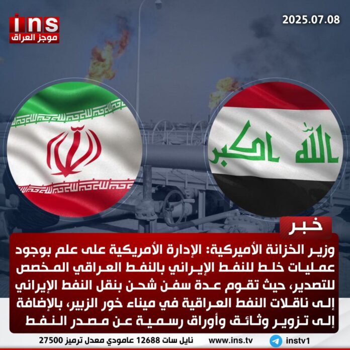 وزير الخزانة الأميركية: الإدارة الأمريكية على علم بوجود عمليات خلط للنفط الإيراني بالنفط العراقي المخصص للتصدير، حيث تقوم عدة سفن شحن بنقل النفط الإيراني إلى ناقلات النفط العراقية في ميناء خور الزبير، بالإضافة إلى تزوير وثائق وأوراق رسمية عن مصدر النفط