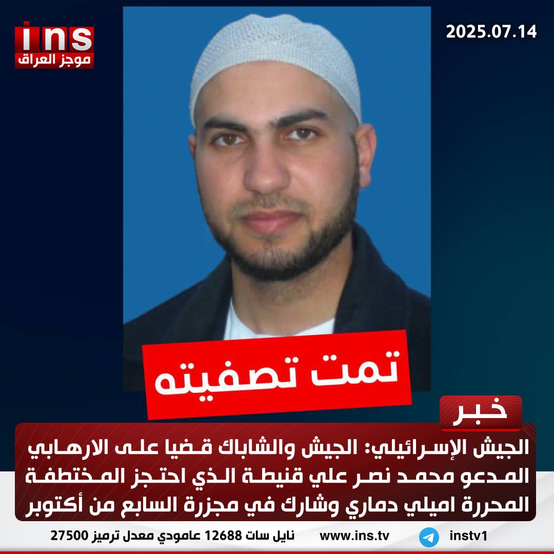 الرئيسيةالأخبارالجيش الإسرائيلي: الجيش والشاباك قضيا على الارهابي المدعو محمد نصر علي قنيطة... الأخبار الجيش الإسرائيلي: الجيش والشاباك قضيا على الارهابي المدعو محمد نصر علي قنيطة الذي احتجز المختطفة المحررة اميلي دماري وشارك في مجزرة السابع من أكتوبر 0 163 يوليو 14, 2025 كتب بواسطة موجز العراق ins شارك FacebookTwitterPinterestWhatsAppTelegramViberCopy URL شارك FacebookTwitterPinterestWhatsAppTelegramViberCopy URL مقالات ذات صلة الأخبار مسيرة إسرائيلية تستهدف سيارة في بلدة تول جنوب لبنان نوفمبر 13, 2025 الأخبار المبعوث الأميركي توم باراك: سوريا بعيد انضمامها إلى التحالف الدولي لمكافحة منظمة داعش الإرهابية سوف تسهم في مواجهة وتفكيك الشبكات الإرهابية من بقايا التنظيم... نوفمبر 13, 2025 الأخبار القيادة المركزية في الجيش الأمريكي “سنتكوم” تعلن عن مقتل واعتقال عدد من عناصر تنظيم داعش الإرهابي خلال 22 عملية مشتركة في سوريا الشهر الماضي نوفمبر 13, 2025