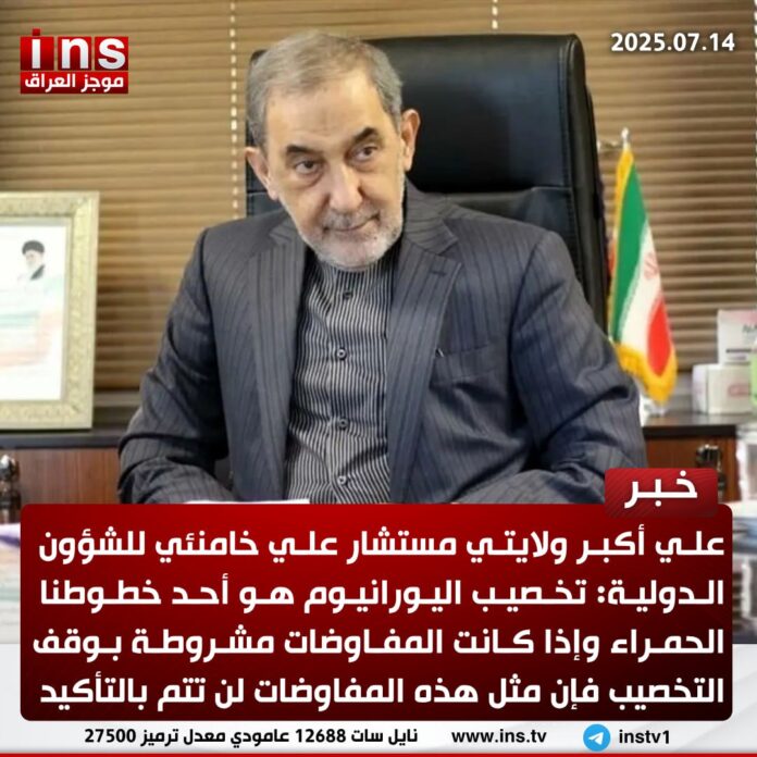 علي أكبر ولايتي مستشار علي خامنئي للشؤون الدولية: تخصيب اليورانيوم هو أحد خطوطنا الحمراء وإذا كانت المفاوضات مشروطة بوقف التخصيب فإن مثل هذه المفاوضات لن تتم بالتأكيد