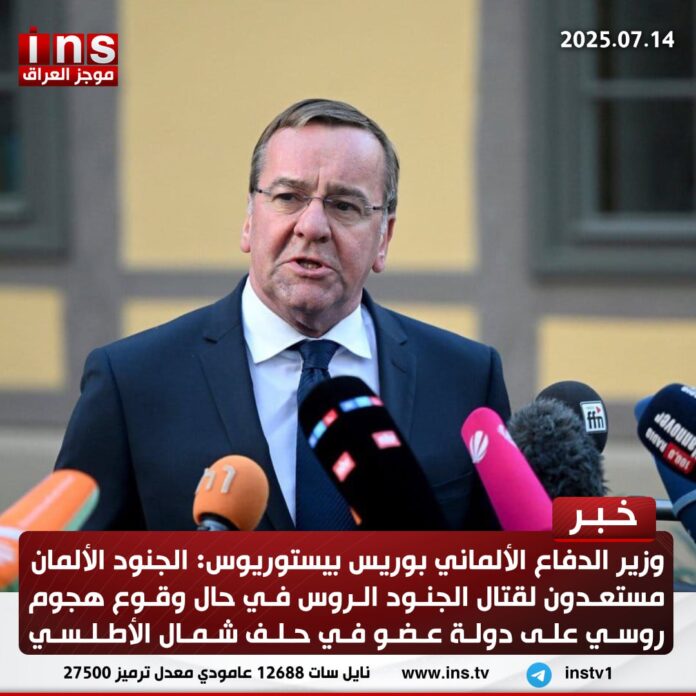 الرئيسيةالأخباروزير الدفاع الألماني بوريس بيستوريوس: الجنود الألمان مستعدون لقتال الجنود الروس في... الأخبار وزير الدفاع الألماني بوريس بيستوريوس: الجنود الألمان مستعدون لقتال الجنود الروس في حال وقوع هجوم روسي على دولة عضو في حلف شمال الأطلسي 0 146 يوليو 14, 2025 كتب بواسطة موجز العراق ins شارك FacebookTwitterPinterestWhatsAppTelegramViberCopy URL شارك FacebookTwitterPinterestWhatsAppTelegramViberCopy URL مقالات ذات صلة الأخبار مسيرة إسرائيلية تستهدف سيارة في بلدة تول جنوب لبنان نوفمبر 13, 2025 الأخبار المبعوث الأميركي توم باراك: سوريا بعيد انضمامها إلى التحالف الدولي لمكافحة منظمة داعش الإرهابية سوف تسهم في مواجهة وتفكيك الشبكات الإرهابية من بقايا التنظيم... نوفمبر 13, 2025 الأخبار القيادة المركزية في الجيش الأمريكي “سنتكوم” تعلن عن مقتل واعتقال عدد من عناصر تنظيم داعش الإرهابي خلال 22 عملية مشتركة في سوريا الشهر الماضي نوفمبر 13, 2025