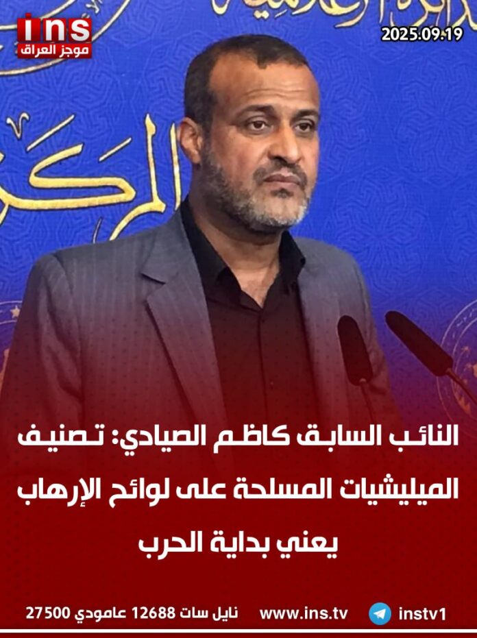 الرئيسيةالأخبارالنائب السابق كاظم الصيادي: تصنيف الميليشيات المسلحة على لوائح الإرهاب يعني بداية... الأخبار النائب السابق كاظم الصيادي: تصنيف الميليشيات المسلحة على لوائح الإرهاب يعني بداية الحرب 0 49 سبتمبر 19, 2025 كتب بواسطة موجز العراق ins شارك FacebookTwitterPinterestWhatsAppTelegramViberCopy URL شارك FacebookTwitterPinterestWhatsAppTelegramViberCopy URL مقالات ذات صلة الأخبار الدكتور اسماعيل مصبح الوائلي: المخطط الذي أعده محمد شياع السوداني مع مدير مكتبه إحسان العوادي وربيع نادر وبعض اذرعة السوداني في جهاز المخابرات العراقي... نوفمبر 8, 2025 الأخبار الدكتور اسماعيل مصبح الوائلي: المخابرات الاردنية تحبط مخطط السوداني لاغتيال مقتدى الصدر نوفمبر 8, 2025 الأخبار الدكتور اسماعيل مصبح الوائلي يكشف عن احباط مؤامرة لرئيس الوزراء العراقي محمد شياع السوداني لاغتيال السيد مقتدى الصدر نوفمبر 8, 2025