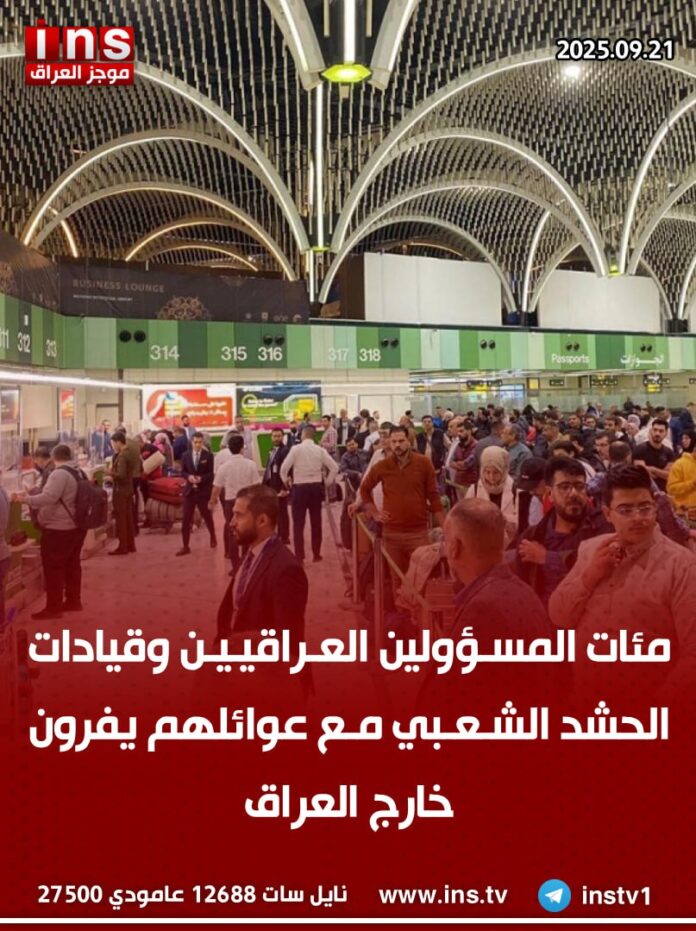 أفادت مصادر أمنية عراقية في مطارات العراق بمغادرة مئات المسؤولين العراقيين وقيادات الحشد الشعبي مع عوائلهم الى خارج البلاد، كما أفادت المصادر بأن هروبهم كان نتيجة التهديد الاسرائيلي بضرب قيادات المنظمات الارهابية في العراق المتمثلة بقيادات الحشد الشعبي واعوانهم قريبا، كما أوضحت المصادر بأن عملية مغادرتهم تمت بسرية تامة واجراءات أمنية محاطة بالسرية والكتمان تاركين أرضهم وبلادهم عرضة للهجمات دون اتخاذ قرار تجاه ما يمر به العراق وشعبه ..