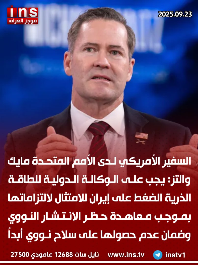 السفير الأمريكي لدى الأمم المتحدة مايك والتز: يجب على الوكالة الدولية للطاقة الذرية الضغط على إيران للامتثال لالتزاماتها بموجب معاهدة حظر الانتشار النووي، وضمان عدم حصولها على سلاح نووي أبداً