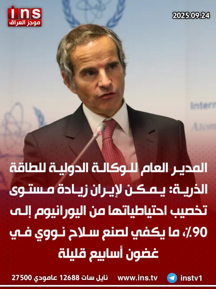 المدير العام للوكالة الدولية للطاقة الذرية: يمكن لإيران زيادة مستوى تخصيب احتياطياتها من اليورانيوم إلى 90%، ما يكفي لصنع سلاح نووي في غضون أسابيع قليلة