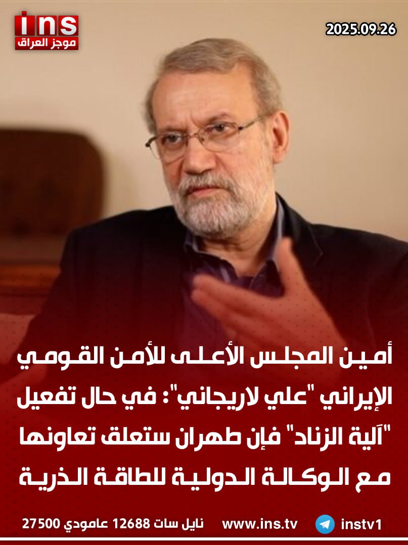 الرئيسيةالأخبارأمين المجلس الأعلى للأمن القومي الإيراني "علي لاريجاني": في حال تفعيل "آلية... الأخبار أمين المجلس الأعلى للأمن القومي الإيراني “علي لاريجاني”: في حال تفعيل “آلية الزناد” فإن طهران ستعلق تعاونها مع الوكالة الدولية للطاقة الذرية 0 57 سبتمبر 26, 2025 كتب بواسطة موجز العراق ins شارك FacebookTwitterPinterestWhatsAppTelegramViberCopy URL شارك FacebookTwitterPinterestWhatsAppTelegramViberCopy URL مقالات ذات صلة الأخبار صحيفة إسرائيل هيوم: طهران حولت أمريكا الجنوبية إلى أحد المراكز الرئيسية لإرهابها نوفمبر 8, 2025 الأخبار وزير الخارجية الأمريكي الأسبق مايك بومبيو: أيام نيكولاس مادورو معدودة في فنزويلا نوفمبر 8, 2025 الأخبار وكالة أسوشيتد برس: احتمال تلقي الميليشيات في العراق ضربات أمريكية وإسرائيلية لا يزال قائماً نوفمبر 8, 2025
