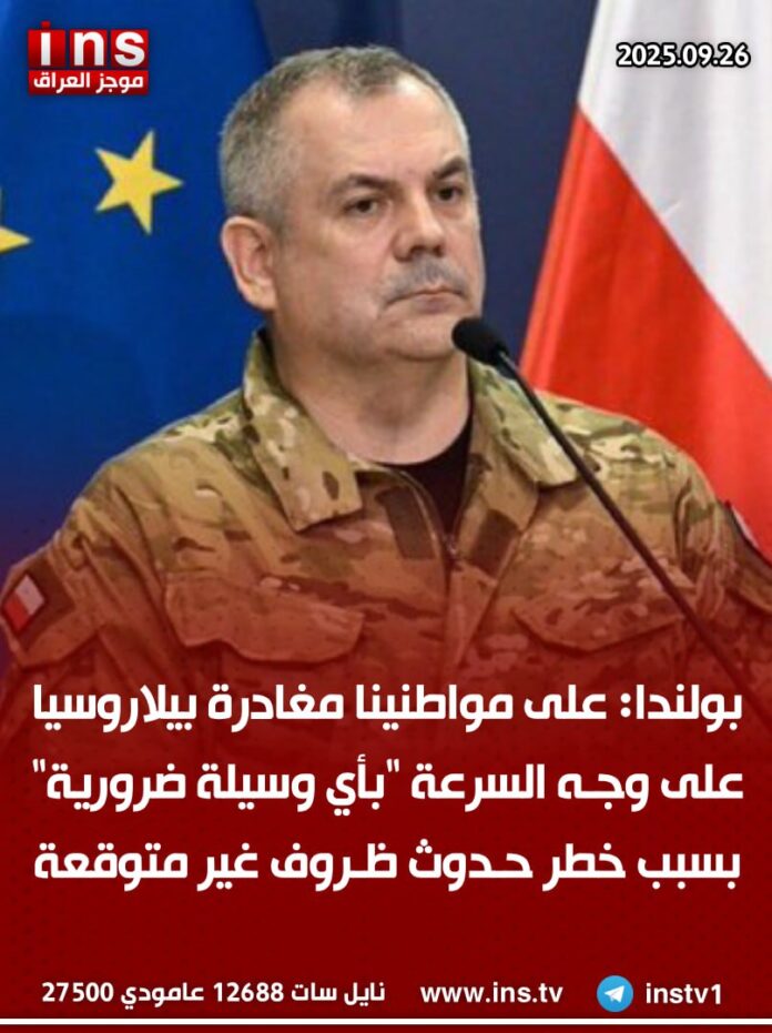 الرئيسيةالأخباربولندا: على مواطنينا مغادرة بيلاروسيا على وجه السرعة "بأي وسيلة ضرورية" بسبب... الأخبار بولندا: على مواطنينا مغادرة بيلاروسيا على وجه السرعة “بأي وسيلة ضرورية” بسبب خطر حدوث ظروف غير متوقعة 0 57 سبتمبر 26, 2025 كتب بواسطة موجز العراق ins شارك FacebookTwitterPinterestWhatsAppTelegramViberCopy URL شارك FacebookTwitterPinterestWhatsAppTelegramViberCopy URL مقالات ذات صلة الأخبار صحيفة إسرائيل هيوم: طهران حولت أمريكا الجنوبية إلى أحد المراكز الرئيسية لإرهابها نوفمبر 8, 2025 الأخبار وزير الخارجية الأمريكي الأسبق مايك بومبيو: أيام نيكولاس مادورو معدودة في فنزويلا نوفمبر 8, 2025 الأخبار وكالة أسوشيتد برس: احتمال تلقي الميليشيات في العراق ضربات أمريكية وإسرائيلية لا يزال قائماً نوفمبر 8, 2025