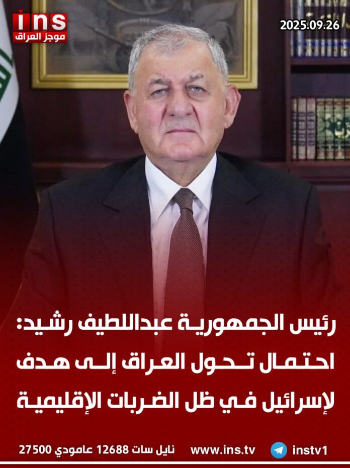 الرئيسيةالأخباررئيس الجمهورية عبداللطيف رشيد: احتمال تحول العراق إلى هدف لإسرائيل في ظل... الأخبار رئيس الجمهورية عبداللطيف رشيد: احتمال تحول العراق إلى هدف لإسرائيل في ظل الضربات الإقليمية 0 33 سبتمبر 26, 2025 كتب بواسطة موجز العراق ins شارك FacebookTwitterPinterestWhatsAppTelegramViberCopy URL شارك FacebookTwitterPinterestWhatsAppTelegramViberCopy URL مقالات ذات صلة الأخبار الدكتور اسماعيل مصبح الوائلي: المخطط الذي أعده محمد شياع السوداني مع مدير مكتبه إحسان العوادي وربيع نادر وبعض اذرعة السوداني في جهاز المخابرات العراقي... نوفمبر 8, 2025 الأخبار الدكتور اسماعيل مصبح الوائلي: المخابرات الاردنية تحبط مخطط السوداني لاغتيال مقتدى الصدر نوفمبر 8, 2025 الأخبار الدكتور اسماعيل مصبح الوائلي يكشف عن احباط مؤامرة لرئيس الوزراء العراقي محمد شياع السوداني لاغتيال السيد مقتدى الصدر نوفمبر 8, 2025