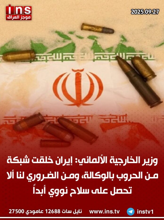 الرئيسيةالأخباروزير الخارجية الألماني: إيران خلقت شبكة من الحروب بالوكالة، ومن الضروري لنا... الأخبار وزير الخارجية الألماني: إيران خلقت شبكة من الحروب بالوكالة، ومن الضروري لنا ألا تحصل على سلاح نووي أبداً 0 77 سبتمبر 27, 2025 كتب بواسطة موجز العراق ins شارك FacebookTwitterPinterestWhatsAppTelegramViberCopy URL شارك FacebookTwitterPinterestWhatsAppTelegramViberCopy URL مقالات ذات صلة الأخبار أجهزة الاستخبارات النمساوية تكتشف مستودع أسلحة في فيينا يشتبه في ارتباطه بحركة حماس الإرهابية كان معداً لشن هجمات إرهابية محتملة في أوروبا نوفمبر 7, 2025 الأخبار إيران تعلن عن اختبار صاروخ باليستي جديد عابر للقارات بمدى 10 آلاف كيلومتر قادر على ضرب الأراضي الأمريكية نوفمبر 7, 2025 الأخبار السفارة الأمريكية في بيروت: واشنطن ستستخدم كل الوسائل لمنع حزب الله من تهديد لبنان والمنطقة نوفمبر 7, 2025