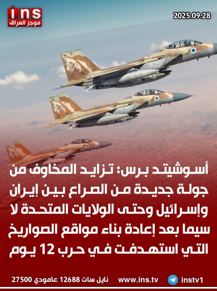 الرئيسيةالأخبارأسوشيتد برس: تزايد المخاوف من جولة جديدة من الصراع بين إيران وإسرائيل... الأخبار أسوشيتد برس: تزايد المخاوف من جولة جديدة من الصراع بين إيران وإسرائيل وحتى الولايات المتحدة لا سيما بعد إعادة بناء مواقع الصواريخ التي استهدفت في حرب 12 يوم 0 54 سبتمبر 28, 2025 كتب بواسطة موجز العراق ins شارك FacebookTwitterPinterestWhatsAppTelegramViberCopy URL شارك FacebookTwitterPinterestWhatsAppTelegramViberCopy URL مقالات ذات صلة الأخبار أجهزة الاستخبارات النمساوية تكتشف مستودع أسلحة في فيينا يشتبه في ارتباطه بحركة حماس الإرهابية كان معداً لشن هجمات إرهابية محتملة في أوروبا نوفمبر 7, 2025 الأخبار إيران تعلن عن اختبار صاروخ باليستي جديد عابر للقارات بمدى 10 آلاف كيلومتر قادر على ضرب الأراضي الأمريكية نوفمبر 7, 2025 الأخبار السفارة الأمريكية في بيروت: واشنطن ستستخدم كل الوسائل لمنع حزب الله من تهديد لبنان والمنطقة نوفمبر 7, 2025