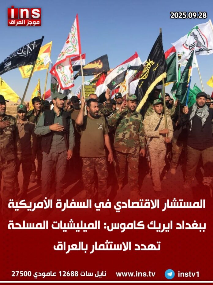 الرئيسيةالأخبارالمستشار الاقتصادي في السفارة الأمريكية ببغداد ايريك كاموس: الميليشيات المسلحة تهدد الاستثمار... الأخبار المستشار الاقتصادي في السفارة الأمريكية ببغداد ايريك كاموس: الميليشيات المسلحة تهدد الاستثمار بالعراق 0 61 سبتمبر 28, 2025 كتب بواسطة موجز العراق ins شارك FacebookTwitterPinterestWhatsAppTelegramViberCopy URL شارك FacebookTwitterPinterestWhatsAppTelegramViberCopy URL مقالات ذات صلة الأخبار أجهزة الاستخبارات النمساوية تكتشف مستودع أسلحة في فيينا يشتبه في ارتباطه بحركة حماس الإرهابية كان معداً لشن هجمات إرهابية محتملة في أوروبا نوفمبر 7, 2025 الأخبار إيران تعلن عن اختبار صاروخ باليستي جديد عابر للقارات بمدى 10 آلاف كيلومتر قادر على ضرب الأراضي الأمريكية نوفمبر 7, 2025 الأخبار السفارة الأمريكية في بيروت: واشنطن ستستخدم كل الوسائل لمنع حزب الله من تهديد لبنان والمنطقة نوفمبر 7, 2025