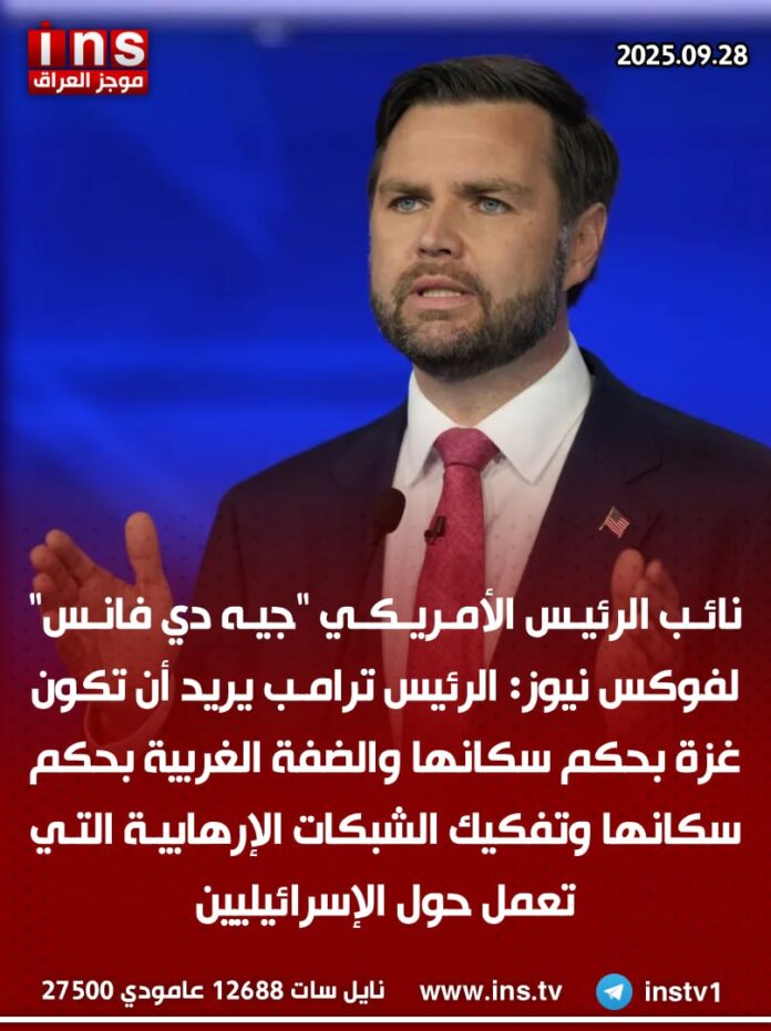 نائب الرئيس الأمريكي “جيه دي فانس” لفوكس نيوز: الرئيس ترامب يريد أن تكون غزة بحكم سكانها والضفة الغربية بحكم سكانها وتفكيك الشبكات الإرهابية التي تعمل حول الإسرائيليين