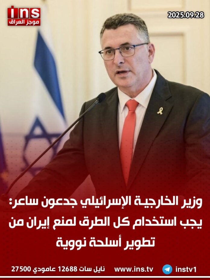 الرئيسيةالأخباروزير الخارجية الإسرائيلي جدعون ساعر: يجب استخدام كل الطرق لمنع إيران من... الأخبار وزير الخارجية الإسرائيلي جدعون ساعر: يجب استخدام كل الطرق لمنع إيران من تطوير أسلحة نووية 0 55 سبتمبر 28, 2025 كتب بواسطة موجز العراق ins شارك FacebookTwitterPinterestWhatsAppTelegramViberCopy URL شارك FacebookTwitterPinterestWhatsAppTelegramViberCopy URL مقالات ذات صلة الأخبار أجهزة الاستخبارات النمساوية تكتشف مستودع أسلحة في فيينا يشتبه في ارتباطه بحركة حماس الإرهابية كان معداً لشن هجمات إرهابية محتملة في أوروبا نوفمبر 7, 2025 الأخبار إيران تعلن عن اختبار صاروخ باليستي جديد عابر للقارات بمدى 10 آلاف كيلومتر قادر على ضرب الأراضي الأمريكية نوفمبر 7, 2025 الأخبار السفارة الأمريكية في بيروت: واشنطن ستستخدم كل الوسائل لمنع حزب الله من تهديد لبنان والمنطقة نوفمبر 7, 2025