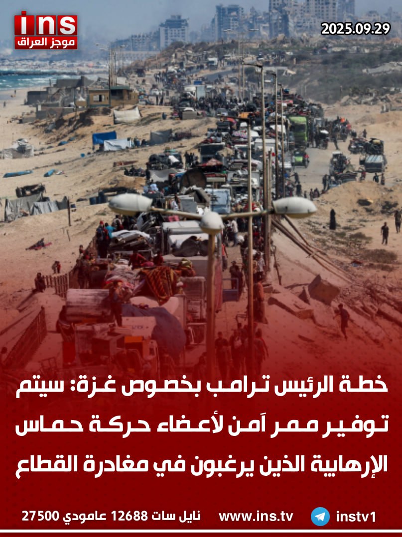 الرئيسيةالأخبارخطة الرئيس ترامب بخصوص غزة: سيتم توفير ممر آمن لأعضاء حركة حماس... الأخبار خطة الرئيس ترامب بخصوص غزة: سيتم توفير ممر آمن لأعضاء حركة حماس الإرهابية الذين يرغبون في مغادرة القطاع 0 31 سبتمبر 29, 2025 كتب بواسطة موجز العراق ins شارك FacebookTwitterPinterestWhatsAppTelegramViberCopy URL شارك FacebookTwitterPinterestWhatsAppTelegramViberCopy URL مقالات ذات صلة الأخبار الدكتور اسماعيل مصبح الوائلي: عقد استثمار مطار بغداد الدولي للثلاثي نمير العقابي وفائق زيدان وناصر عبد الحسين شعبان، مقابل تبرئة محمد شياع السوداني قضائياً... نوفمبر 6, 2025 الأخبار صحيفة إسرائيل هيوم: علي خامنئي سيكون أحد الأهداف الرئيسية للهجمات الإسرائيلية في حال اندلاع حرب جديدة مع إيران نوفمبر 6, 2025 الأخبار مجلس الشيوخ الأسترالي يدرج الحرس الثوري الإيراني بقوائم الإرهاب نوفمبر 6, 2025