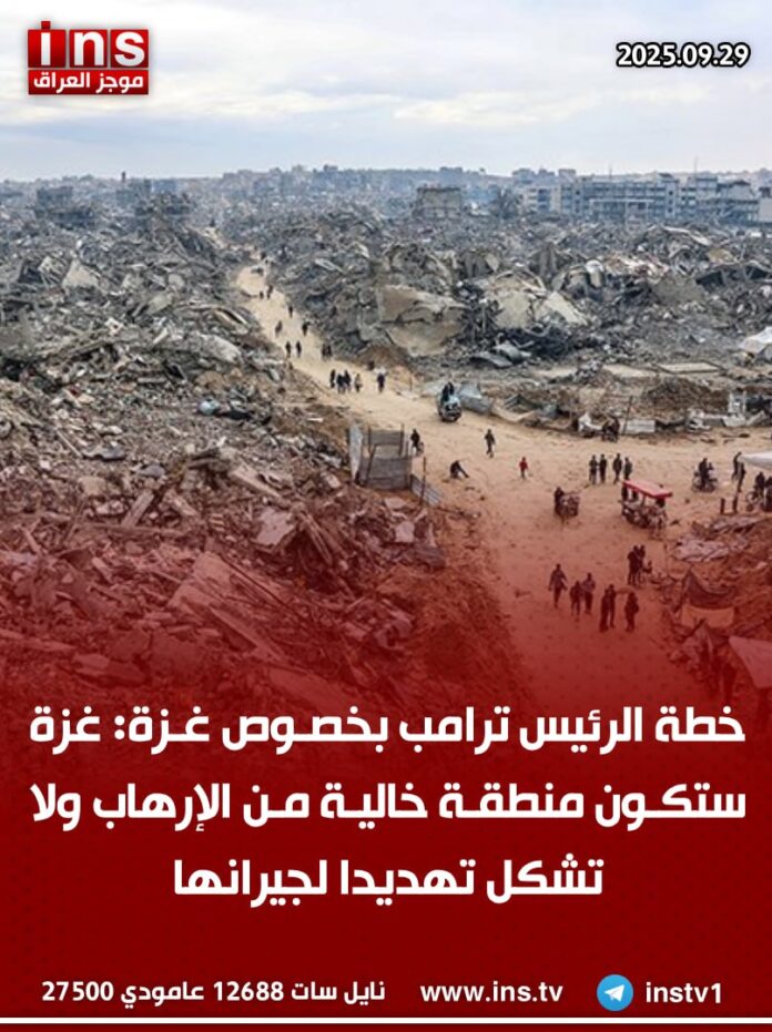 الرئيسيةالأخبارخطة الرئيس ترامب بخصوص غزة: غزة ستكون منطقة خالية من الإرهاب ولا... الأخبار خطة الرئيس ترامب بخصوص غزة: غزة ستكون منطقة خالية من الإرهاب ولا تشكل تهديدا لجيرانها 0 26 سبتمبر 29, 2025 كتب بواسطة موجز العراق ins شارك FacebookTwitterPinterestWhatsAppTelegramViberCopy URL شارك FacebookTwitterPinterestWhatsAppTelegramViberCopy URL مقالات ذات صلة الأخبار الدكتور اسماعيل مصبح الوائلي: عقد استثمار مطار بغداد الدولي للثلاثي نمير العقابي وفائق زيدان وناصر عبد الحسين شعبان، مقابل تبرئة محمد شياع السوداني قضائياً... نوفمبر 6, 2025 الأخبار صحيفة إسرائيل هيوم: علي خامنئي سيكون أحد الأهداف الرئيسية للهجمات الإسرائيلية في حال اندلاع حرب جديدة مع إيران نوفمبر 6, 2025 الأخبار مجلس الشيوخ الأسترالي يدرج الحرس الثوري الإيراني بقوائم الإرهاب نوفمبر 6, 2025