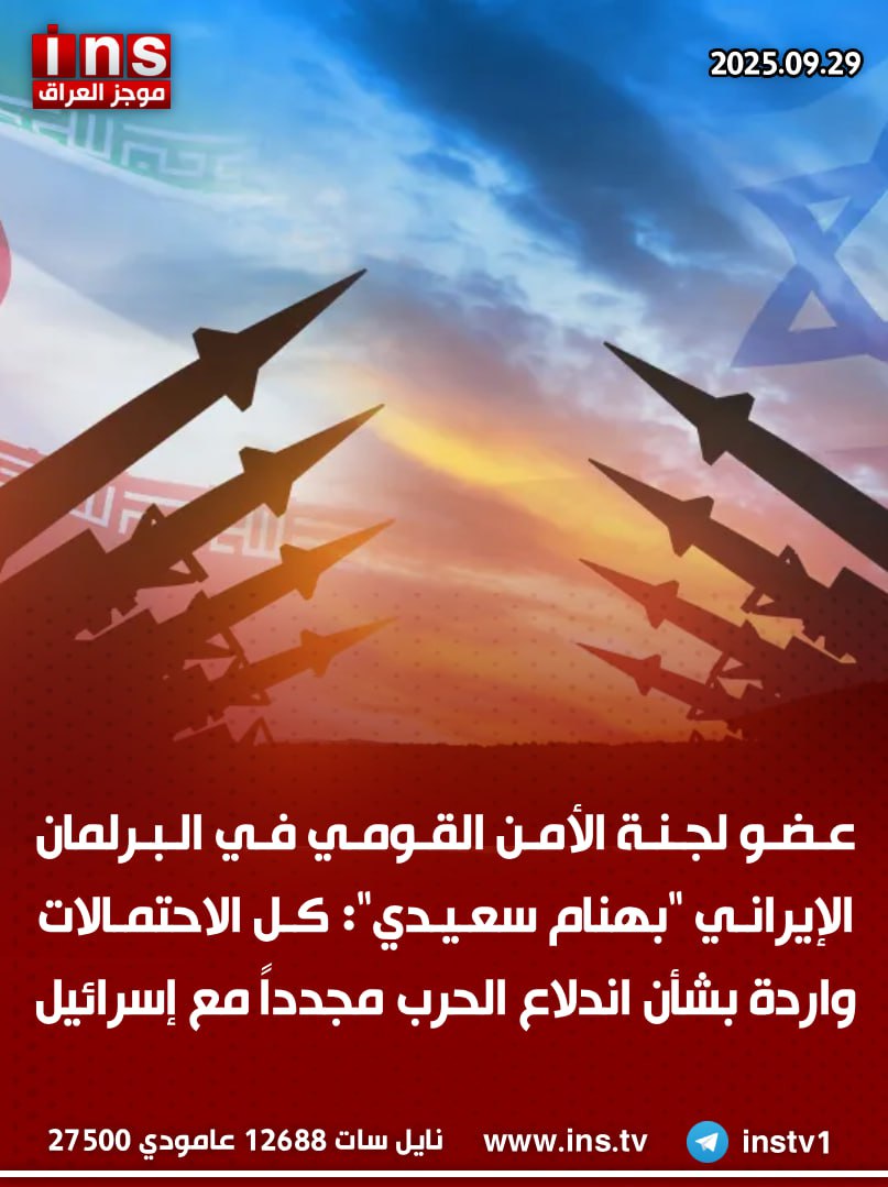 الرئيسيةالأخبارعضو لجنة الأمن القومي في البرلمان الإيراني "بهنام سعيدي": كل الاحتمالات واردة... الأخبار عضو لجنة الأمن القومي في البرلمان الإيراني “بهنام سعيدي”: كل الاحتمالات واردة بشأن اندلاع الحرب مجدداً مع إسرائيل 0 68 سبتمبر 29, 2025 كتب بواسطة موجز العراق ins شارك FacebookTwitterPinterestWhatsAppTelegramViberCopy URL شارك FacebookTwitterPinterestWhatsAppTelegramViberCopy URL مقالات ذات صلة الأخبار سلاح الجو الإسرائيلي يشن سلسلة غارات على أهداف عسكرية تابعة لمنظمة حزب الله الإرهابية في جنوب لبنان نوفمبر 6, 2025 الأخبار الجيش الإسرائيلي: بدأنا سلسلة غارات على أهداف عسكرية تابعة لمنظمة حزب الله الإرهابية في جنوب لبنان نوفمبر 6, 2025 الأخبار إنذار عاجل.. سيهاجم جيش الدفاع الإسرائيلي على المدى الزمني القريب بنى تحتية عسكرية تابعة لحزب الله الإرهابي في أنحاء جنوب لبنان وذلك للتعامل مع... نوفمبر 6, 2025
