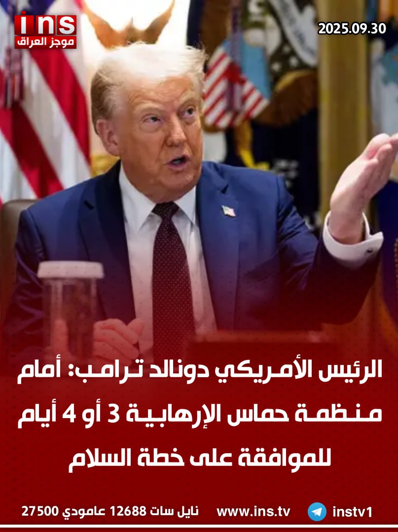 الرئيسيةالأخبارالرئيس الأمريكي دونالد ترامب: أمام منظمة حماس الإرهابية 3 أو 4 أيام... الأخبار الرئيس الأمريكي دونالد ترامب: أمام منظمة حماس الإرهابية 3 أو 4 أيام للموافقة على خطة السلام 0 69 سبتمبر 30, 2025 كتب بواسطة موجز العراق ins شارك FacebookTwitterPinterestWhatsAppTelegramViberCopy URL شارك FacebookTwitterPinterestWhatsAppTelegramViberCopy URL مقالات ذات صلة الأخبار الدنمارك تعتقل أفغانياً بتهمة التجسس لصالح إيران والتخطيط لاستهداف مؤسسات يهودية في ألمانيا نوفمبر 5, 2025 الأخبار المدير العام للوكالة الدولية للطاقة الذرية رافائيل غروسي: إيران على حافة مواجهة جديدة مع الغرب إن لم تستأنف تعاونها النووي نوفمبر 5, 2025 الأخبار الباحث في مركز القدس للشؤون الخارجية والأمنية “يوني بن مناحيم”: هناك ضوء أخضر مبدئي من الإدارة الأمريكية لإسرائيل للتحرك عسكرياً ضد حزب الله يتعلق... نوفمبر 5, 2025