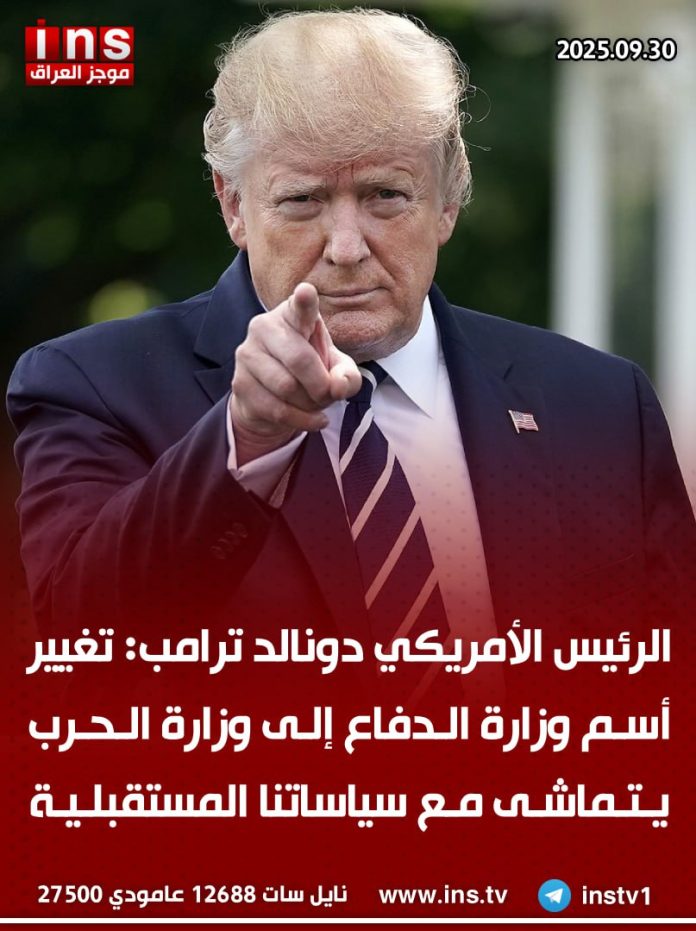 الرئيسيةالأخبارالرئيس الأمريكي دونالد ترامب: تغيير أسم وزارة الدفاع إلى وزارة الحرب يتماشى... الأخبار الرئيس الأمريكي دونالد ترامب: تغيير أسم وزارة الدفاع إلى وزارة الحرب يتماشى مع سياساتنا المستقبلية 0 77 سبتمبر 30, 2025 كتب بواسطة موجز العراق ins شارك FacebookTwitterPinterestWhatsAppTelegramViberCopy URL شارك FacebookTwitterPinterestWhatsAppTelegramViberCopy URL مقالات ذات صلة الأخبار الدنمارك تعتقل أفغانياً بتهمة التجسس لصالح إيران والتخطيط لاستهداف مؤسسات يهودية في ألمانيا نوفمبر 5, 2025 الأخبار المدير العام للوكالة الدولية للطاقة الذرية رافائيل غروسي: إيران على حافة مواجهة جديدة مع الغرب إن لم تستأنف تعاونها النووي نوفمبر 5, 2025 الأخبار الباحث في مركز القدس للشؤون الخارجية والأمنية “يوني بن مناحيم”: هناك ضوء أخضر مبدئي من الإدارة الأمريكية لإسرائيل للتحرك عسكرياً ضد حزب الله يتعلق... نوفمبر 5, 2025