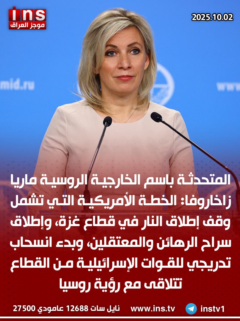 المتحدثة باسم الخارجية الروسية ماريا زاخاروفا: الخطة الأمريكية التي تشمل وقف إطلاق النار في قطاع غزة، وإطلاق سراح الرهائن والمعتقلين، وبدء انسحاب تدريجي للقوات الإسرائيلية من القطاع تتلاقى مع رؤية روسيا