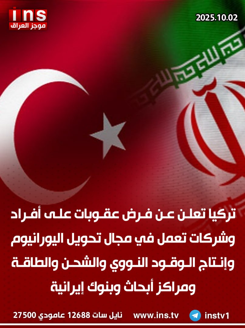 الرئيسيةالأخبارتركيا تعلن عن فرض عقوبات على أفراد وشركات تعمل في مجال تحويل... الأخبار تركيا تعلن عن فرض عقوبات على أفراد وشركات تعمل في مجال تحويل اليورانيوم وإنتاج الوقود النووي والشحن والطاقة ومراكز أبحاث وبنوك إيرانية 0 43 أكتوبر 2, 2025 كتب بواسطة موجز العراق ins شارك FacebookTwitterPinterestWhatsAppTelegramViberCopy URL شارك FacebookTwitterPinterestWhatsAppTelegramViberCopy URL مقالات ذات صلة الأخبار الدنمارك تعتقل أفغانياً بتهمة التجسس لصالح إيران والتخطيط لاستهداف مؤسسات يهودية في ألمانيا نوفمبر 5, 2025 الأخبار المدير العام للوكالة الدولية للطاقة الذرية رافائيل غروسي: إيران على حافة مواجهة جديدة مع الغرب إن لم تستأنف تعاونها النووي نوفمبر 5, 2025 الأخبار الباحث في مركز القدس للشؤون الخارجية والأمنية “يوني بن مناحيم”: هناك ضوء أخضر مبدئي من الإدارة الأمريكية لإسرائيل للتحرك عسكرياً ضد حزب الله يتعلق... نوفمبر 5, 2025