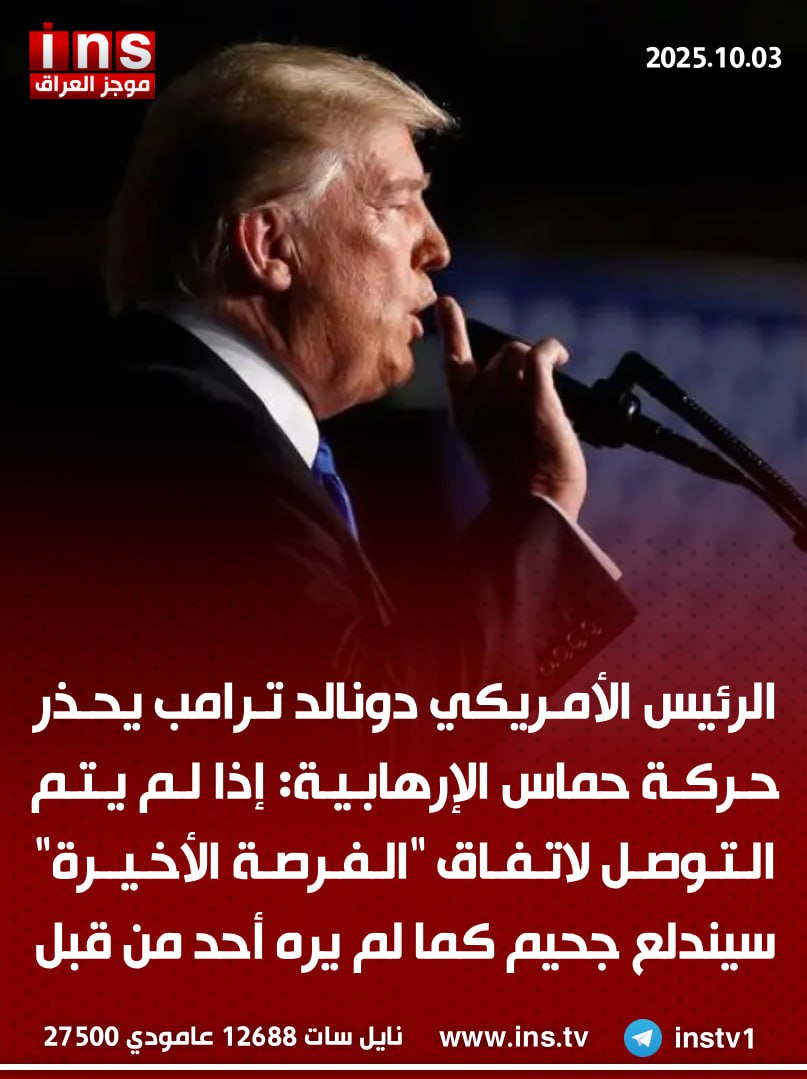 الرئيسيةالأخبارالرئيس الأمريكي دونالد ترامب يحذر حركة حماس الإرهابية: إذا لم يتم التوصل... الأخبار الرئيس الأمريكي دونالد ترامب يحذر حركة حماس الإرهابية: إذا لم يتم التوصل لاتفاق “الفرصة الأخيرة” سيندلع جحيم كما لم يره أحد من قبل 0 37 أكتوبر 3, 2025 كتب بواسطة موجز العراق ins شارك FacebookTwitterPinterestWhatsAppTelegramViberCopy URL شارك FacebookTwitterPinterestWhatsAppTelegramViberCopy URL مقالات ذات صلة الأخبار الدنمارك تعتقل أفغانياً بتهمة التجسس لصالح إيران والتخطيط لاستهداف مؤسسات يهودية في ألمانيا نوفمبر 5, 2025 الأخبار المدير العام للوكالة الدولية للطاقة الذرية رافائيل غروسي: إيران على حافة مواجهة جديدة مع الغرب إن لم تستأنف تعاونها النووي نوفمبر 5, 2025 الأخبار الباحث في مركز القدس للشؤون الخارجية والأمنية “يوني بن مناحيم”: هناك ضوء أخضر مبدئي من الإدارة الأمريكية لإسرائيل للتحرك عسكرياً ضد حزب الله يتعلق... نوفمبر 5, 2025