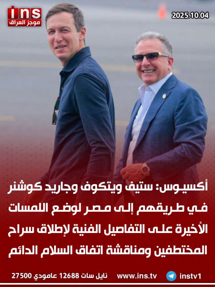 الرئيسيةالأخبارأكسيوس: ستيف ويتكوف وجاريد كوشنر في طريقهم إلى مصر لوضع اللمسات الأخيرة... الأخبار أكسيوس: ستيف ويتكوف وجاريد كوشنر في طريقهم إلى مصر لوضع اللمسات الأخيرة على التفاصيل الفنية لإطلاق سراح المختطفين ومناقشة اتفاق السلام الدائم 0 48 أكتوبر 4, 2025 كتب بواسطة موجز العراق ins شارك FacebookTwitterPinterestWhatsAppTelegramViberCopy URL شارك FacebookTwitterPinterestWhatsAppTelegramViberCopy URL مقالات ذات صلة الأخبار المدير العام للوكالة الدولية للطاقة الذرية رافائيل غروسي: إيران على حافة مواجهة جديدة مع الغرب إن لم تستأنف تعاونها النووي نوفمبر 5, 2025 الأخبار الباحث في مركز القدس للشؤون الخارجية والأمنية “يوني بن مناحيم”: هناك ضوء أخضر مبدئي من الإدارة الأمريكية لإسرائيل للتحرك عسكرياً ضد حزب الله يتعلق... نوفمبر 5, 2025 الأخبار الباحث في مركز القدس للشؤون الخارجية والأمنية “يوني بن مناحيم”: حزب الله الإرهابي جددت تمويله وأسلحته والحكومة اللبنانية عاجزة عن تفكيكها نوفمبر 5, 2025