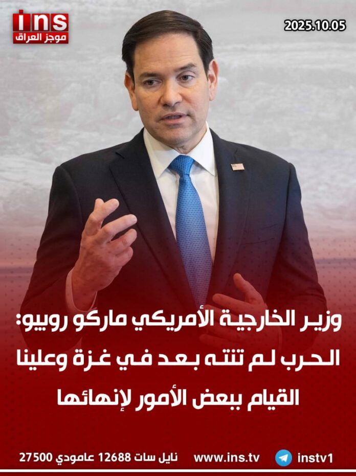 الرئيسيةالأخباروزير الخارجية الأمريكي ماركو روبيو: الحرب لم تنته بعد في غزة وعلينا... الأخبار وزير الخارجية الأمريكي ماركو روبيو: الحرب لم تنته بعد في غزة وعلينا القيام ببعض الأمور لإنهائها 0 45 أكتوبر 5, 2025 كتب بواسطة موجز العراق ins شارك FacebookTwitterPinterestWhatsAppTelegramViberCopy URL شارك FacebookTwitterPinterestWhatsAppTelegramViberCopy URL مقالات ذات صلة الأخبار غارة بطائرة مسيرة إسرائيلية تستهدف سيارة بالقرب من بلدة برج رحال جنوب لبنان نوفمبر 5, 2025 الأخبار قناة إيران الإخبارية عن مسؤولين عسكريين: علي خامنئي أذن بـ”مدى صاروخي غير محدود” حيث تنوي إيران تشغيل صواريخ باليستية عابرة للقارات يصل مداها إلى... نوفمبر 4, 2025 الأخبار وكيل وزارة الخزانة الأمريكية لشؤون الإرهاب والاستخبارات المالية “جون هيرلي”: رأس الوحش في طهران وأذرعه هي وكلائه الذين يغذون عدم الاستقرار والإرهاب نوفمبر 4, 2025