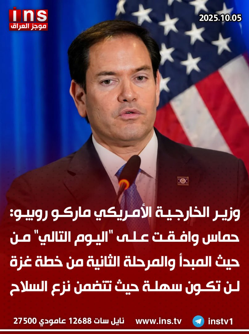 الرئيسيةالأخباروزير الخارجية الأمريكي ماركو روبيو: حماس وافقت على "اليوم التالي" من حيث... الأخبار وزير الخارجية الأمريكي ماركو روبيو: حماس وافقت على “اليوم التالي” من حيث المبدأ والمرحلة الثانية من خطة غزة لن تكون سهلة حيث تتضمن نزع السلاح 0 56 أكتوبر 5, 2025 كتب بواسطة موجز العراق ins شارك FacebookTwitterPinterestWhatsAppTelegramViberCopy URL شارك FacebookTwitterPinterestWhatsAppTelegramViberCopy URL مقالات ذات صلة الأخبار غارة بطائرة مسيرة إسرائيلية تستهدف سيارة بالقرب من بلدة برج رحال جنوب لبنان نوفمبر 5, 2025 الأخبار قناة إيران الإخبارية عن مسؤولين عسكريين: علي خامنئي أذن بـ”مدى صاروخي غير محدود” حيث تنوي إيران تشغيل صواريخ باليستية عابرة للقارات يصل مداها إلى... نوفمبر 4, 2025 الأخبار وكيل وزارة الخزانة الأمريكية لشؤون الإرهاب والاستخبارات المالية “جون هيرلي”: رأس الوحش في طهران وأذرعه هي وكلائه الذين يغذون عدم الاستقرار والإرهاب نوفمبر 4, 2025