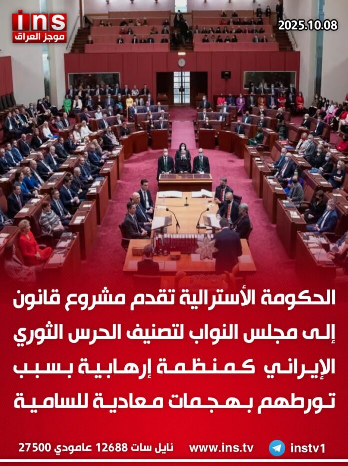 الرئيسيةالأخبارالحكومة الأسترالية تقدم مشروع قانون إلى مجلس النواب لتصنيف الحرس الثوري الإيراني... الأخبار الحكومة الأسترالية تقدم مشروع قانون إلى مجلس النواب لتصنيف الحرس الثوري الإيراني كمنظمة إرهابية بسبب تورطهم بهجمات معادية للسامية 0 44 أكتوبر 8, 2025 كتب بواسطة موجز العراق ins شارك FacebookTwitterPinterestWhatsAppTelegramViberCopy URL شارك FacebookTwitterPinterestWhatsAppTelegramViberCopy URL مقالات ذات صلة الأخبار قناة إيران الإخبارية عن مسؤولين عسكريين: علي خامنئي أذن بـ”مدى صاروخي غير محدود” حيث تنوي إيران تشغيل صواريخ باليستية عابرة للقارات يصل مداها إلى... نوفمبر 4, 2025 الأخبار وكيل وزارة الخزانة الأمريكية لشؤون الإرهاب والاستخبارات المالية “جون هيرلي”: رأس الوحش في طهران وأذرعه هي وكلائه الذين يغذون عدم الاستقرار والإرهاب نوفمبر 4, 2025 الأخبار وكيل وزارة الخزانة الأمريكية لشؤون الإرهاب والاستخبارات المالية “جون هيرلي”: إيران هي في قلب عدم الاستقرار الإقليمي وهي وحش ذي الأذرع المتعددة نوفمبر 4, 2025