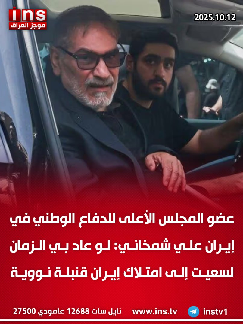 الرئيسيةالأخبارعضو المجلس الأعلى للدفاع الوطني في إيران علي شمخاني: لو عاد بي... الأخبار عضو المجلس الأعلى للدفاع الوطني في إيران علي شمخاني: لو عاد بي الزمان لسعيت إلى امتلاك إيران قنبلة نووية 0 57 أكتوبر 12, 2025 كتب بواسطة موجز العراق ins شارك FacebookTwitterPinterestWhatsAppTelegramViberCopy URL شارك FacebookTwitterPinterestWhatsAppTelegramViberCopy URL مقالات ذات صلة الأخبار النائب سعود الساعدي عن نتائج التحقيق بمخالفات في محافظة البصرة يكشف عن قيام محافظ البصرة اسعد العيداني بسرقة مبلغ مقدارة 4 تريليون و500 مليار... نوفمبر 3, 2025 الأخبار مقتل عنصر في منظمة حزب الله الإرهابية يدعى يوسف سرور بمسيرة إسرائيلية استهدفت دراجته النارية في قرية عيتا الشعب بلبنان نوفمبر 3, 2025 الأخبار مبعوث الرئيس ترامب للشؤون الأفريقية: إدارة الرئيس ترامب اقترحت خطة لوقف الحرب بالسودان، وتلقينا موافقة مبدئية ورد إيجابي من طرفي الصراع، خصوصاً من جانب... نوفمبر 3, 2025