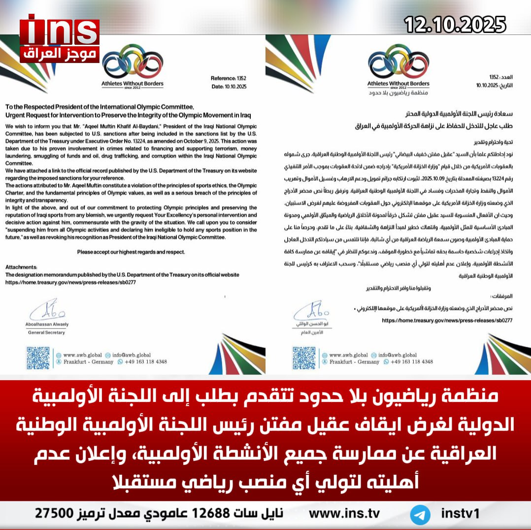 منظمة رياضيون بلا حدود تتقدم بطلب إلى اللجنة الأولمبية الدولية لغرض ايقاف عقيل مفتن رئيس اللجنة الأولمبية الوطنية العراقية عن ممارسة جميع الأنشطة الأولمبية، وإعلان عدم أهليته لتولي أي منصب رياضي مستقبلاً