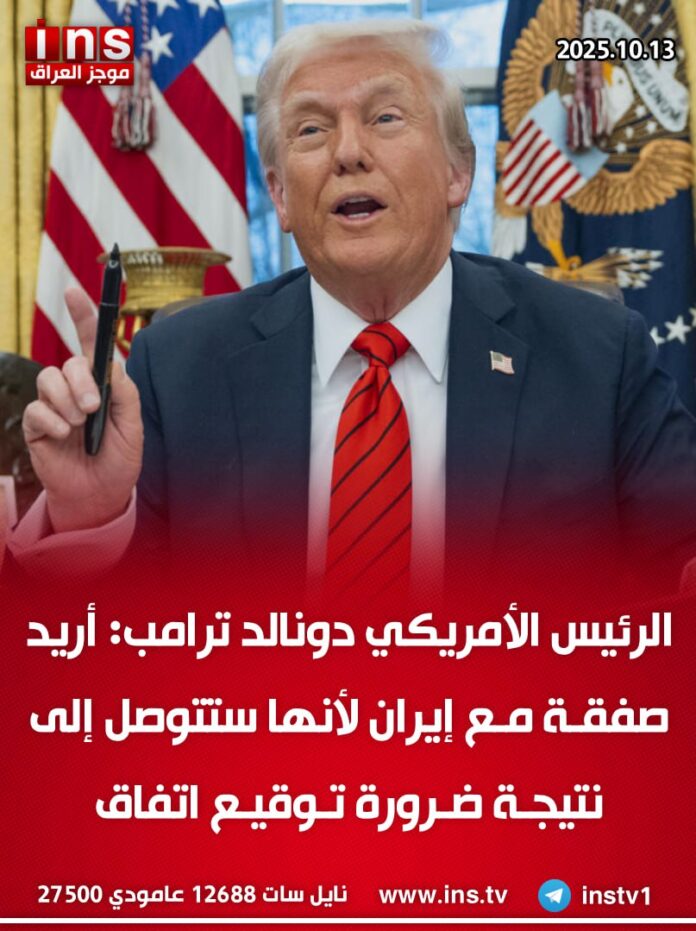الرئيسيةالأخبارالرئيس الأمريكي دونالد ترامب: أريد صفقة مع إيران لأنها ستتوصل إلى نتيجة... الأخبار الرئيس الأمريكي دونالد ترامب: أريد صفقة مع إيران لأنها ستتوصل إلى نتيجة ضرورة توقيع اتفاق 0 46 أكتوبر 13, 2025 كتب بواسطة موجز العراق ins شارك FacebookTwitterPinterestWhatsAppTelegramViberCopy URL شارك FacebookTwitterPinterestWhatsAppTelegramViberCopy URL مقالات ذات صلة الأخبار النائب سعود الساعدي عن نتائج التحقيق بمخالفات في محافظة البصرة يكشف عن قيام محافظ البصرة اسعد العيداني بسرقة مبلغ مقدارة 4 تريليون و500 مليار... نوفمبر 3, 2025 الأخبار مقتل عنصر في منظمة حزب الله الإرهابية يدعى يوسف سرور بمسيرة إسرائيلية استهدفت دراجته النارية في قرية عيتا الشعب بلبنان نوفمبر 3, 2025 الأخبار مبعوث الرئيس ترامب للشؤون الأفريقية: إدارة الرئيس ترامب اقترحت خطة لوقف الحرب بالسودان، وتلقينا موافقة مبدئية ورد إيجابي من طرفي الصراع، خصوصاً من جانب... نوفمبر 3, 2025