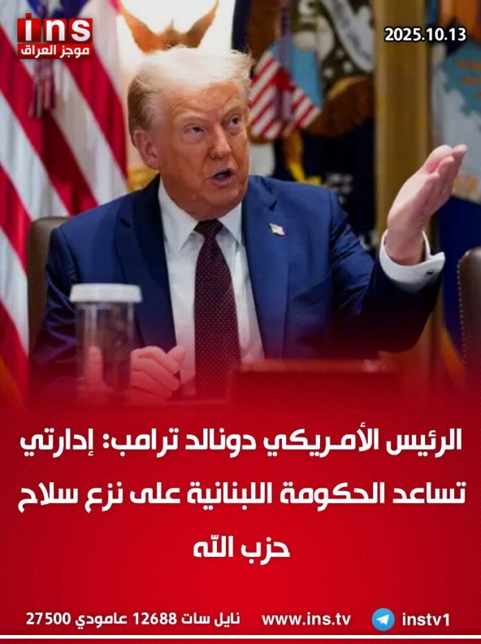 الرئيسيةالأخبارالرئيس الأمريكي دونالد ترامب: إدارتي تساعد الحكومة اللبنانية على نزع سلاح حزب... الأخبار الرئيس الأمريكي دونالد ترامب: إدارتي تساعد الحكومة اللبنانية على نزع سلاح حزب الله 0 45 أكتوبر 13, 2025 كتب بواسطة موجز العراق ins شارك FacebookTwitterPinterestWhatsAppTelegramViberCopy URL شارك FacebookTwitterPinterestWhatsAppTelegramViberCopy URL مقالات ذات صلة الأخبار النائب سعود الساعدي عن نتائج التحقيق بمخالفات في محافظة البصرة يكشف عن قيام محافظ البصرة اسعد العيداني بسرقة مبلغ مقدارة 4 تريليون و500 مليار... نوفمبر 3, 2025 الأخبار مقتل عنصر في منظمة حزب الله الإرهابية يدعى يوسف سرور بمسيرة إسرائيلية استهدفت دراجته النارية في قرية عيتا الشعب بلبنان نوفمبر 3, 2025 الأخبار مبعوث الرئيس ترامب للشؤون الأفريقية: إدارة الرئيس ترامب اقترحت خطة لوقف الحرب بالسودان، وتلقينا موافقة مبدئية ورد إيجابي من طرفي الصراع، خصوصاً من جانب... نوفمبر 3, 2025