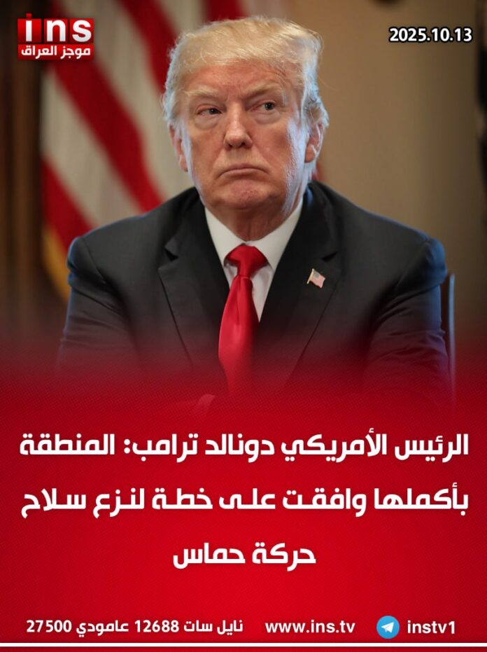الرئيسيةالأخبارالرئيس الأمريكي دونالد ترامب: المنطقة بأكملها وافقت على خطة لنزع سلاح حركة... الأخبار الرئيس الأمريكي دونالد ترامب: المنطقة بأكملها وافقت على خطة لنزع سلاح حركة حماس 0 42 أكتوبر 13, 2025 كتب بواسطة موجز العراق ins شارك FacebookTwitterPinterestWhatsAppTelegramViberCopy URL شارك FacebookTwitterPinterestWhatsAppTelegramViberCopy URL مقالات ذات صلة الأخبار النائب سعود الساعدي عن نتائج التحقيق بمخالفات في محافظة البصرة يكشف عن قيام محافظ البصرة اسعد العيداني بسرقة مبلغ مقدارة 4 تريليون و500 مليار... نوفمبر 3, 2025 الأخبار مقتل عنصر في منظمة حزب الله الإرهابية يدعى يوسف سرور بمسيرة إسرائيلية استهدفت دراجته النارية في قرية عيتا الشعب بلبنان نوفمبر 3, 2025 الأخبار مبعوث الرئيس ترامب للشؤون الأفريقية: إدارة الرئيس ترامب اقترحت خطة لوقف الحرب بالسودان، وتلقينا موافقة مبدئية ورد إيجابي من طرفي الصراع، خصوصاً من جانب... نوفمبر 3, 2025