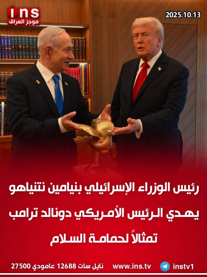 الرئيسيةالأخباررئيس الوزراء الإسرائيلي بنيامين نتنياهو يهدي الرئيس الأمريكي دونالد ترامب تمثالاً لحمامة... الأخبار رئيس الوزراء الإسرائيلي بنيامين نتنياهو يهدي الرئيس الأمريكي دونالد ترامب تمثالاً لحمامة السلام 0 58 أكتوبر 13, 2025 كتب بواسطة موجز العراق ins شارك FacebookTwitterPinterestWhatsAppTelegramViberCopy URL شارك FacebookTwitterPinterestWhatsAppTelegramViberCopy URL مقالات ذات صلة الأخبار النائب سعود الساعدي عن نتائج التحقيق بمخالفات في محافظة البصرة يكشف عن قيام محافظ البصرة اسعد العيداني بسرقة مبلغ مقدارة 4 تريليون و500 مليار... نوفمبر 3, 2025 الأخبار مقتل عنصر في منظمة حزب الله الإرهابية يدعى يوسف سرور بمسيرة إسرائيلية استهدفت دراجته النارية في قرية عيتا الشعب بلبنان نوفمبر 3, 2025 الأخبار مبعوث الرئيس ترامب للشؤون الأفريقية: إدارة الرئيس ترامب اقترحت خطة لوقف الحرب بالسودان، وتلقينا موافقة مبدئية ورد إيجابي من طرفي الصراع، خصوصاً من جانب... نوفمبر 3, 2025