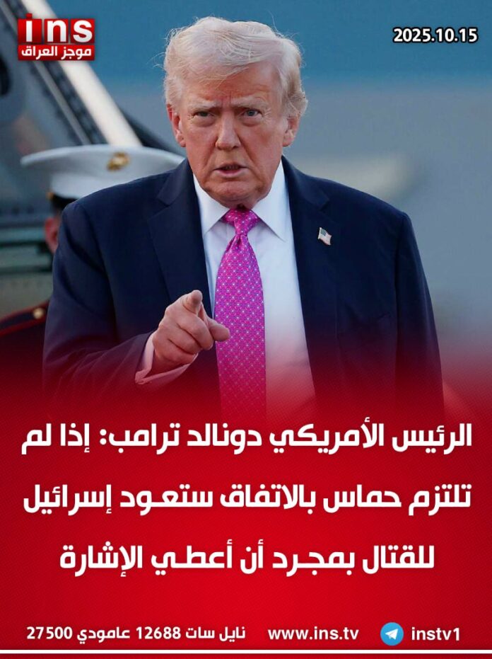 الرئيسيةالأخبارالرئيس الأمريكي دونالد ترامب: إذا لم تلتزم حماس بالاتفاق ستعود إسرائيل للقتال... الأخبار الرئيس الأمريكي دونالد ترامب: إذا لم تلتزم حماس بالاتفاق ستعود إسرائيل للقتال بمجرد أن أعطي الإشارة 0 38 أكتوبر 15, 2025 كتب بواسطة موجز العراق ins شارك FacebookTwitterPinterestWhatsAppTelegramViberCopy URL شارك FacebookTwitterPinterestWhatsAppTelegramViberCopy URL مقالات ذات صلة الأخبار المبعوث الأمريكي توم براك: لا وقت أمام لبنان وعليه حصر السلاح سريعاً، وإسرائيل تقصف جنوبي لبنان يوميا لأن سلاح حزب الله لا يزال موجوداً نوفمبر 1, 2025 الأخبار مديرة الاستخبارات الأميركية “تولسي غابارد”: الوضع في إيران مازال مقلقاً ورصد تحركات جديدة بمنشآتها النووية نوفمبر 1, 2025 الأخبار إعلام أمريكي: فنزويلا تواصلت مع روسيا والصين وإيران لطلب صواريخ ومسيرات ورادارات تحسباً لهجوم أمريكي محتمل نوفمبر 1, 2025