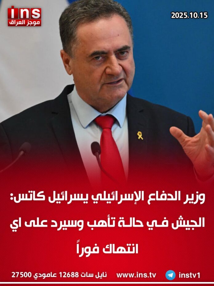 الرئيسيةالأخباروزير الدفاع الإسرائيلي يسرائيل كاتس: الجيش في حالة تأهب وسيرد على اي... الأخبار وزير الدفاع الإسرائيلي يسرائيل كاتس: الجيش في حالة تأهب وسيرد على اي انتهاك فوراً 0 33 أكتوبر 15, 2025 كتب بواسطة موجز العراق ins شارك FacebookTwitterPinterestWhatsAppTelegramViberCopy URL شارك FacebookTwitterPinterestWhatsAppTelegramViberCopy URL مقالات ذات صلة الأخبار غارات جوية إسرائيلية تستهدف اهداف تابعة لمنظمة حزب الله الإرهابية في النبطية جنوب لبنان نوفمبر 2, 2025 الأخبار وزيرة الخارجية البريطانية للحدث: نريد نزعاً كاملاً لسلاح حزب الله نوفمبر 2, 2025 الأخبار وزيرة الخارجية البريطانية للحدث: إيران لا زالت تشكل تهديدا مباشرا لأمننا القومي نوفمبر 2, 2025