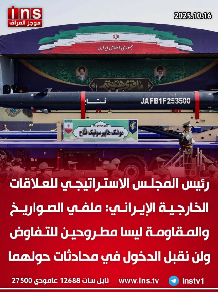 الرئيسيةالأخباررئيس المجلس الاستراتيجي للعلاقات الخارجية الإيراني: ملفي الصواريخ والمقاومة ليسا مطروحين للتفاوض... الأخبار رئيس المجلس الاستراتيجي للعلاقات الخارجية الإيراني: ملفي الصواريخ والمقاومة ليسا مطروحين للتفاوض ولن نقبل الدخول في محادثات حولهما 0 28 أكتوبر 16, 2025 كتب بواسطة موجز العراق ins شارك FacebookTwitterPinterestWhatsAppTelegramViberCopy URL شارك FacebookTwitterPinterestWhatsAppTelegramViberCopy URL مقالات ذات صلة الأخبار المبعوث الأمريكي توم براك: لا وقت أمام لبنان وعليه حصر السلاح سريعاً، وإسرائيل تقصف جنوبي لبنان يوميا لأن سلاح حزب الله لا يزال موجوداً نوفمبر 1, 2025 الأخبار مديرة الاستخبارات الأميركية “تولسي غابارد”: الوضع في إيران مازال مقلقاً ورصد تحركات جديدة بمنشآتها النووية نوفمبر 1, 2025 الأخبار إعلام أمريكي: فنزويلا تواصلت مع روسيا والصين وإيران لطلب صواريخ ومسيرات ورادارات تحسباً لهجوم أمريكي محتمل نوفمبر 1, 2025