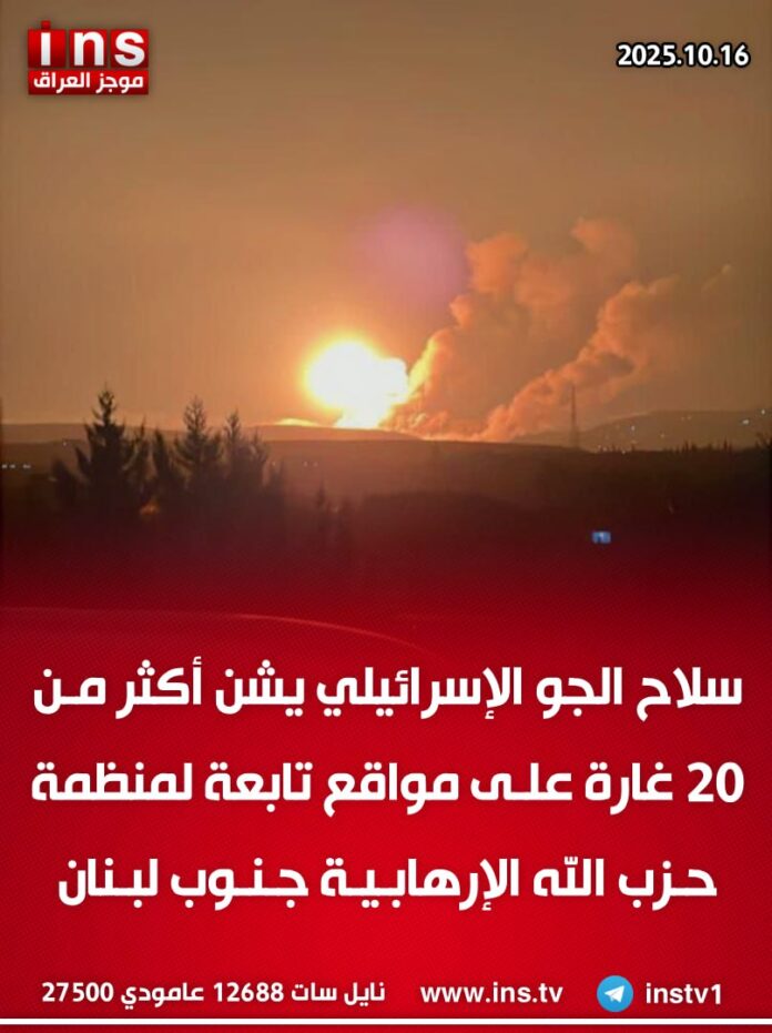 الرئيسيةالأخبارسلاح الجو الإسرائيلي يشن أكثر من 20 غارة على مواقع تابعة لمنظمة... الأخبار سلاح الجو الإسرائيلي يشن أكثر من 20 غارة على مواقع تابعة لمنظمة حزب الله الإرهابية جنوب لبنان 0 27 أكتوبر 16, 2025 كتب بواسطة موجز العراق ins شارك FacebookTwitterPinterestWhatsAppTelegramViberCopy URL شارك FacebookTwitterPinterestWhatsAppTelegramViberCopy URL مقالات ذات صلة الأخبار وزارة الخارجية الأميركية: على المواطنين الأمريكيين ومزدوجي الجنسية تجنب السفر إلى إيران أكثر من أي وقت مضى أكتوبر 31, 2025 الأخبار وول ستريت جورنال: إدارة الرئيس ترامب حددت أهدافاً داخل فنزويلا من بينها منشآت عسكرية تستخدم في تهريب المخدرات والتي قد تستهدف بضربات جوية في... أكتوبر 31, 2025 الأخبار اي24 نيوز الإسرائيلية: من المرجح بشكل متزايد أن ينهار وقف إطلاق النار في لبنان قبل انهياره في غزة أكتوبر 31, 2025