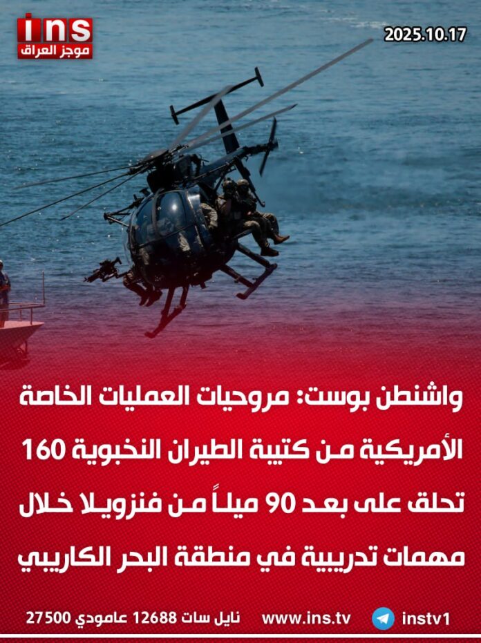 واشنطن بوست: مروحيات العمليات الخاصة الأمريكية من كتيبة الطيران النخبوية 160 تحلق على بعد 90 ميلاً من فنزويلا خلال مهمات تدريبية في منطقة البحر الكاريبي