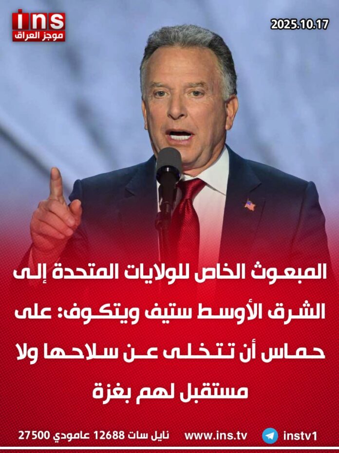 الرئيسيةالأخبارالمبعوث الخاص للولايات المتحدة إلى الشرق الأوسط ستيف ويتكوف: على حماس أن... الأخبار المبعوث الخاص للولايات المتحدة إلى الشرق الأوسط ستيف ويتكوف: على حماس أن تتخلى عن سلاحها ولا مستقبل لهم بغزة 0 24 أكتوبر 17, 2025 كتب بواسطة موجز العراق ins شارك FacebookTwitterPinterestWhatsAppTelegramViberCopy URL شارك FacebookTwitterPinterestWhatsAppTelegramViberCopy URL مقالات ذات صلة الأخبار رئيس الوزراء الإسرائيلي بنيامين نتنياهو: إذا استمرت حركة حماس الإرهابية في انتهاك وقف إطلاق النار فسنستهدفها بضربات قوية أكتوبر 30, 2025 الأخبار الحكومة البريطانية تفرض عقوبات على المقرب من مجتبى خامنئي والحرس الثوري الإيراني علي أنصاري لتسهيله ودعمه أنشطة الحرس الثوري الإيراني العدائية ضد المملكة المتحدة... أكتوبر 30, 2025 الأخبار أكسيوس: الخطة الأميركية لنشر قوة دولية في غزة ستكون جاهزة خلال أسابيع أكتوبر 30, 2025