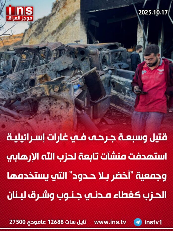 الرئيسيةالأخبارقتيل وسبعة جرحى في غارات إسرائيلية استهدفت منشآت تابعة لحزب الله الإرهابي... الأخبار قتيل وسبعة جرحى في غارات إسرائيلية استهدفت منشآت تابعة لحزب الله الإرهابي وجمعية “أخضر بلا حدود” التي يستخدمها الحزب كغطاء مدني جنوب وشرق لبنان 0 28 أكتوبر 17, 2025 كتب بواسطة موجز العراق ins شارك FacebookTwitterPinterestWhatsAppTelegramViberCopy URL شارك FacebookTwitterPinterestWhatsAppTelegramViberCopy URL مقالات ذات صلة الأخبار رئيس الوزراء الإسرائيلي بنيامين نتنياهو: إذا استمرت حركة حماس الإرهابية في انتهاك وقف إطلاق النار فسنستهدفها بضربات قوية أكتوبر 30, 2025 الأخبار الحكومة البريطانية تفرض عقوبات على المقرب من مجتبى خامنئي والحرس الثوري الإيراني علي أنصاري لتسهيله ودعمه أنشطة الحرس الثوري الإيراني العدائية ضد المملكة المتحدة... أكتوبر 30, 2025 الأخبار أكسيوس: الخطة الأميركية لنشر قوة دولية في غزة ستكون جاهزة خلال أسابيع أكتوبر 30, 2025