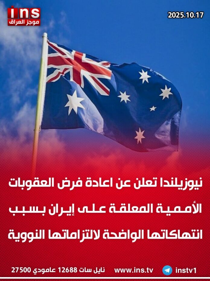 الرئيسيةالأخبارنيوزيلندا تعلن عن اعادة فرض العقوبات الأممية المعلقة على إيران بسبب انتهاكاتها... الأخبار نيوزيلندا تعلن عن اعادة فرض العقوبات الأممية المعلقة على إيران بسبب انتهاكاتها الواضحة لالتزاماتها النووية 0 31 أكتوبر 17, 2025 كتب بواسطة موجز العراق ins شارك FacebookTwitterPinterestWhatsAppTelegramViberCopy URL شارك FacebookTwitterPinterestWhatsAppTelegramViberCopy URL مقالات ذات صلة الأخبار رئيس الوزراء الإسرائيلي بنيامين نتنياهو: إذا استمرت حركة حماس الإرهابية في انتهاك وقف إطلاق النار فسنستهدفها بضربات قوية أكتوبر 30, 2025 الأخبار الحكومة البريطانية تفرض عقوبات على المقرب من مجتبى خامنئي والحرس الثوري الإيراني علي أنصاري لتسهيله ودعمه أنشطة الحرس الثوري الإيراني العدائية ضد المملكة المتحدة... أكتوبر 30, 2025 الأخبار أكسيوس: الخطة الأميركية لنشر قوة دولية في غزة ستكون جاهزة خلال أسابيع أكتوبر 30, 2025