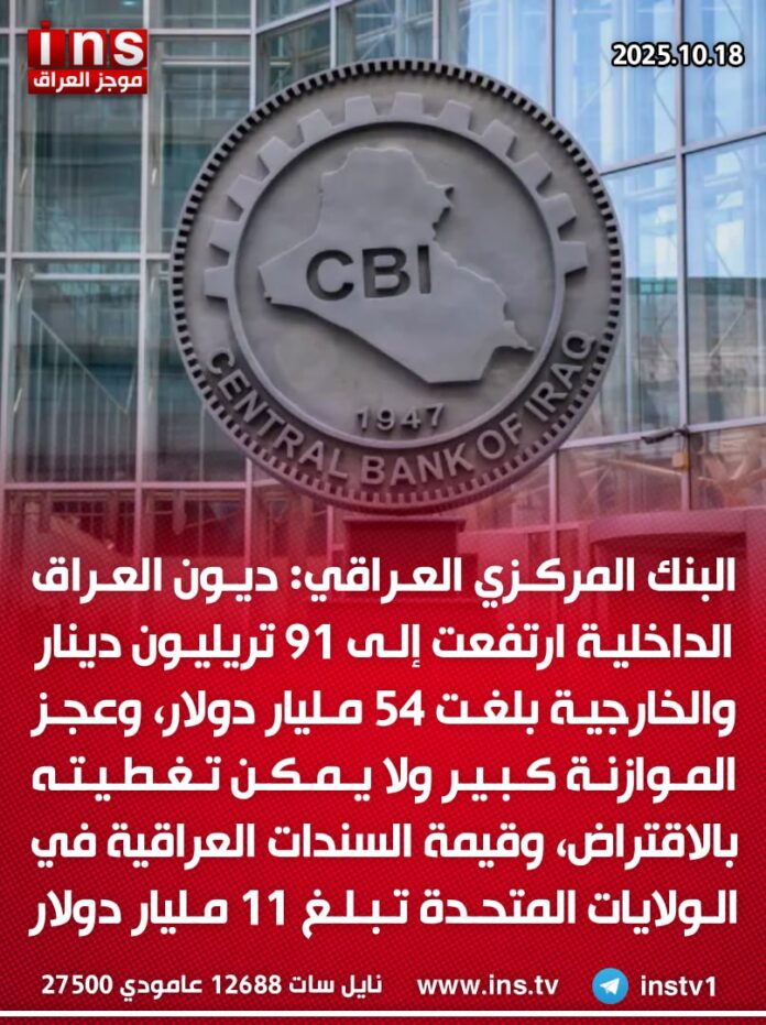 البنك المركزي العراقي: ديون العراق الداخلية ارتفعت إلى 91 تريليون دينار والخارجية بلغت 54 مليار دولار، وعجز الموازنة كبير ولا يمكن تغطيته بالاقتراض، وقيمة السندات العراقية في الولايات المتحدة تبلغ 11 مليار دولار