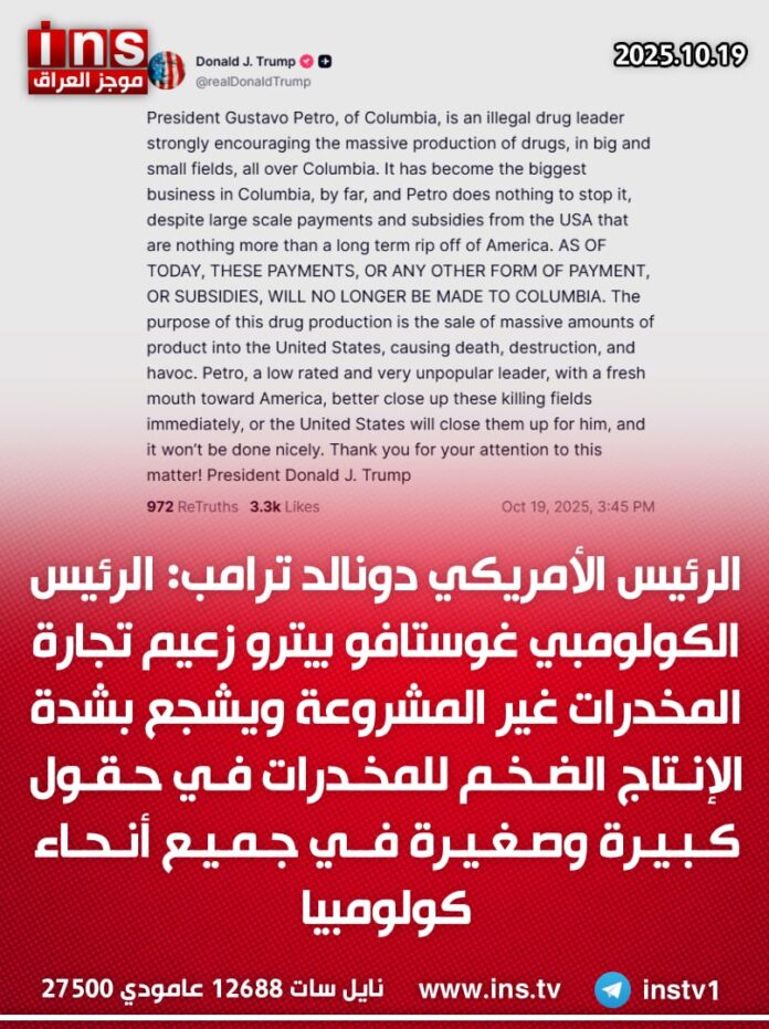 الرئيس الأمريكي دونالد ترامب: الرئيس الكولومبي غوستافو بيترو زعيم تجارة المخدرات غير المشروعة ويشجع بشدة الإنتاج الضخم للمخدرات في حقول كبيرة وصغيرة في جميع أنحاء كولومبيا